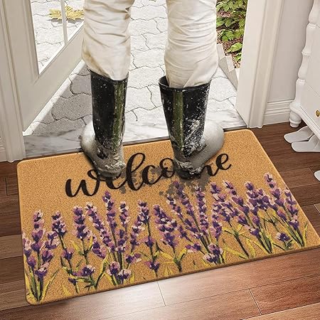 Carvapet Artificial Coir Doormat with Non-Slip Backing for Indoor and Outdoor 17 x 30 inch Front Door Welcome Mat Floral Doormat, Lavender